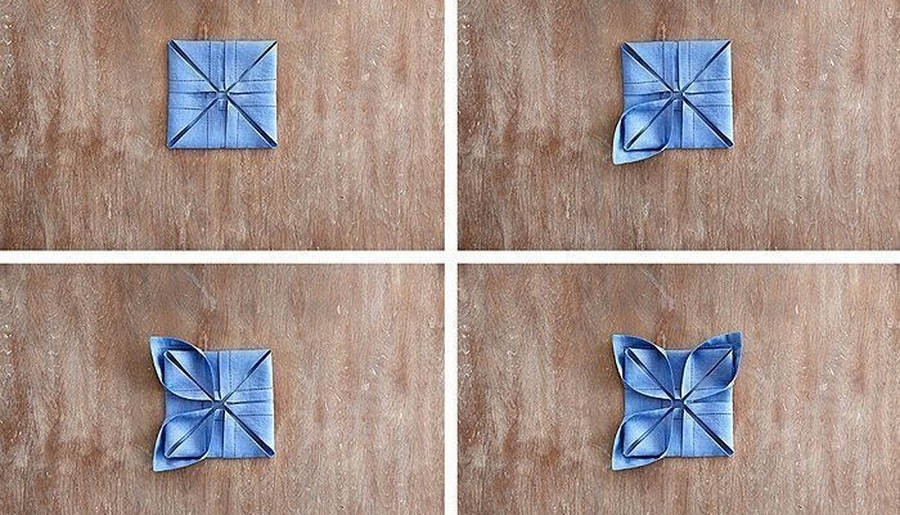 გაშალეთ კვადრატული ფორმის ხელსახოცი. ოთხივე კუთხე ცენტრში გადაკეცეთ. მიიღებთ კვადრატს.