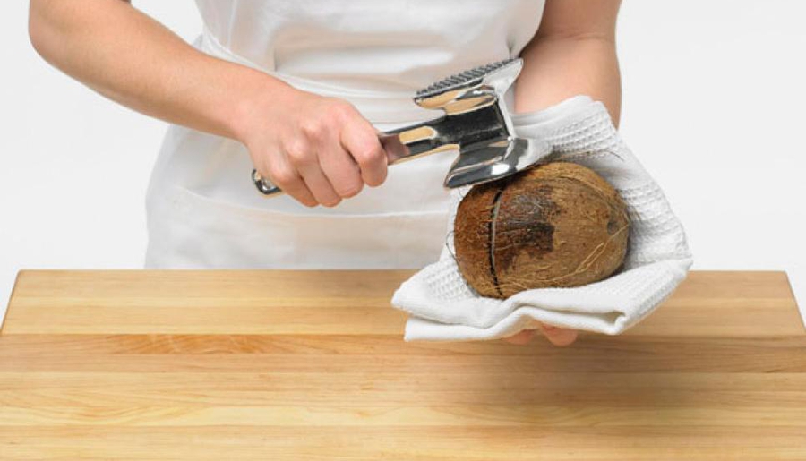 ქოქოსი ჭურჭლის ტილოთი ხელში დაიჭირეთ და შუაგულში ჩაქუჩი ურტყით, თან ხელში ატრიალეთ, სანამ ნაჭუჭი შუაზე არ გაიბზარება.