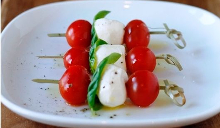 კბილის ჩხირებზე ერთმანეთის მონაცვლეობით ააწყვეთ შუაზე გაჭრილი პომიდორი, რეჰანის ფოთლები და მოცარელას ბურთები ისე, რომ ყველა ინგრედიენტი მთლიანად გამოიყენოთ. მოასხურეთ ზეითუნის ზეთი პომიდორს, რეჰანსა და ყველს ისე, რომ ჩხირის ბოლო სუფთად დარჩეს. მოაყარეთ მარილი და პილპილი. მიირთვით მომზადებისთანავე.